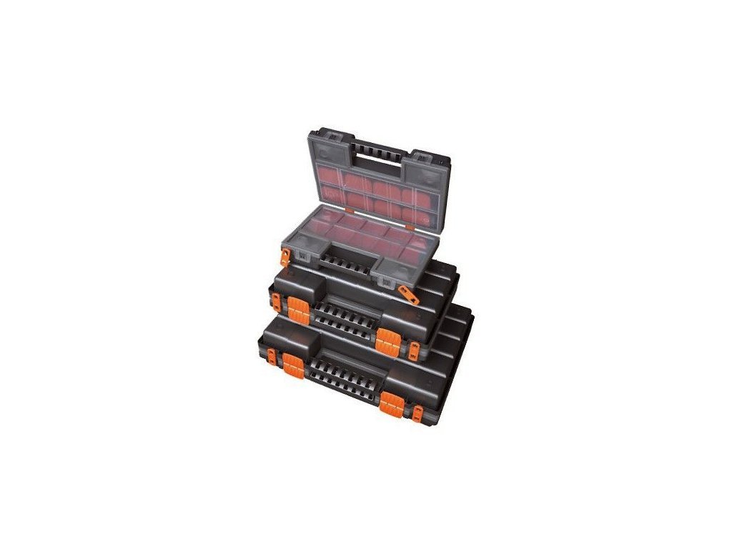 Přenosný dvojitý ruční kufřík, organizér s nastavitelnými příčkami vhodný na šroubky, matice, podložky, těsnění a jiné drobné věci. Všestranné využití v domácnosti, dílnách, pro uskladnění rybářských potřeb apod.