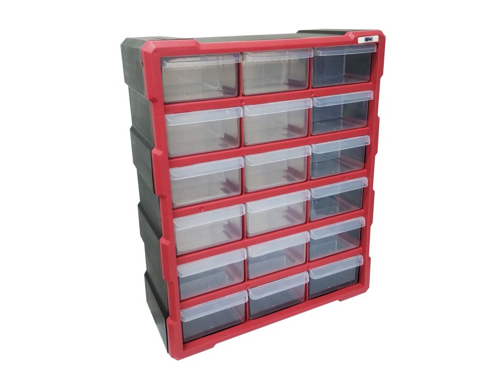 Plastová skříňka s 18 šuplíky je nezbytnou úložnou možností pro vaši dílnu. Je ideální pro uložení drobných předmětů, jako jsou vrtáky, šrouby, hřebíky, matice, podložky, kleště, šroubováky a mnoho dalšího. Skříňka je vyrobena z odolného plastu. Díky průhledným zásuvkám budete mít vždy přehled o uložených předmětech.