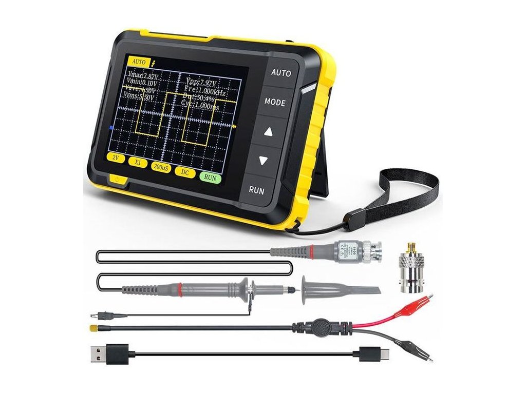 Přenosný osciloskop FNIRSI DSO152 je praktický a cenově výhodný ruční osciloskop. Lze jej použít pro periodické analogové signály, tak i pro neperiodické digitální signály a může měřit napětí až do ±400V.Osciloskop vzorkovací frekvenci v reálném čase 2,5 MS/s a šířku pásma 200 kHz.