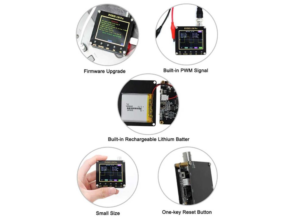 Osciloskop 200kHz FNIRSI-138 Pro, sestavený modul vč.baterie Osciloskop má vzorkovací frekvenci v reálném čase 2,5 MS/s a šířku pásma 200 kHz.Funkční pro periodické analogové signály i aperiodické digitální signály. Lze měřit napětí až do ±400V. Vybavený efektivním jednotlačítkovým AUTO, naměřený průběh lze zobrazit bez těžkopádného nastavování. Displej je vybaven 2,4palcovým LCD displejem s rozlišením 320x240pix. Vestavěná 1000mAh lithiová baterie pro nepřetržitý provoz cca 5 hodin.