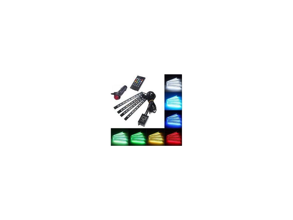 Osvětlení interiéru auta RGB s dálkovým ovládáním 4 samolepící, silikonové a voděodolné LED pásky.Snadná instalace díky použití speciální 3M oboustranné pásky.Dlouhé kabely umožňují pohodlné rozmístění proužků kdekoli uvnitř vozidla.Nový model je také vybaven funkcí osvětlení do rytmu hudby.9 LED světelných bodů v každém ze 4 pásků! Celkem 36 LED světelných bodů!Životnost až 100 000 hodin díky použití LED žárovek SMD5050Až 16 barev osvětlení (RGB), měnitelných.4 režimy osvětlení: konstantní (vybraná konkrétní barva), blikání v RGB, blikání v mnoha barvách a plynulá změna barvyOsvětlený vypínač na 12V zástrčce zapalovače cigaret.Možnost dálkového ovládání přiloženým dálkovým ovladačem nebo telefonem s IrDA portem.Specifikace: