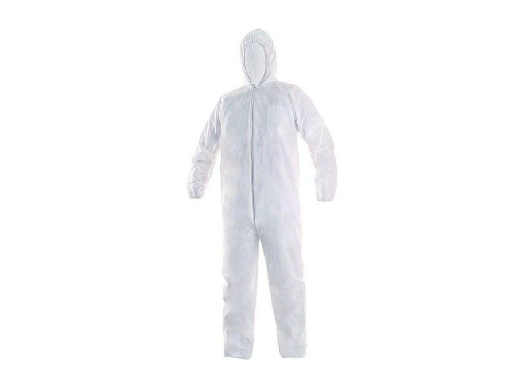 Jednorázový oblek z netkané textilie, zapínání na zip. Kapuce, manžety rukávů a nohavice zakončeny gumičkou. Chrání před prachem a lehkým zašpiněním.