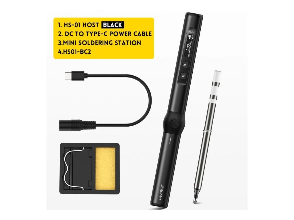 Pájecí pero FNIRSI HS-01 Smart Elektrická programovatelná mikropájka FNIRSI HS-01 SMART poskytuje skvělé možnosti pro profesionály i nadšence do elektroniky. Jedná se o pokročilou páječku s řadou výhod a možností a max. výkonem 65W.Robusní provedení, OLED displej o velikosti 22,1mm. USB-C konektor pro připojení síťového adaptéru Power Delivery (PD) s výstupním napětím 9-20V.
