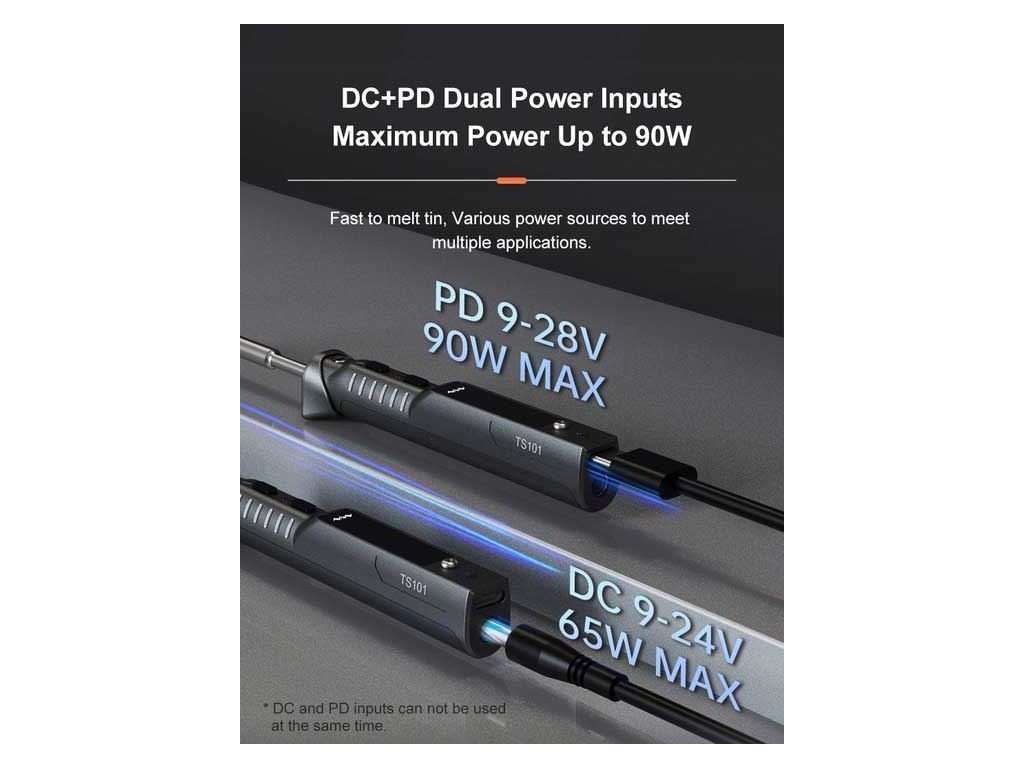 TS101 má OLED displej s rozlišením 128x32 pixelů, na které jsou zobrazeny všechny potřebné informace. Změněný byl typ šroubku pro uchycení hrotu pro snazší výměnu. Vylepšený je také tvar páječky v místě úchopu, na který lze nasadit další část. Pájecí pero neklouže a díky spodní zploštělé části lze odložit tak, aby byl hrot ve vzduchu apájecí pero se nekutálelo. Příjemnou zprávou je také zpětná kompatibilita. TS101 lze použít se stejnými hroty jako TS100. Dodáváme s hrotem v provedení ”BC2”.