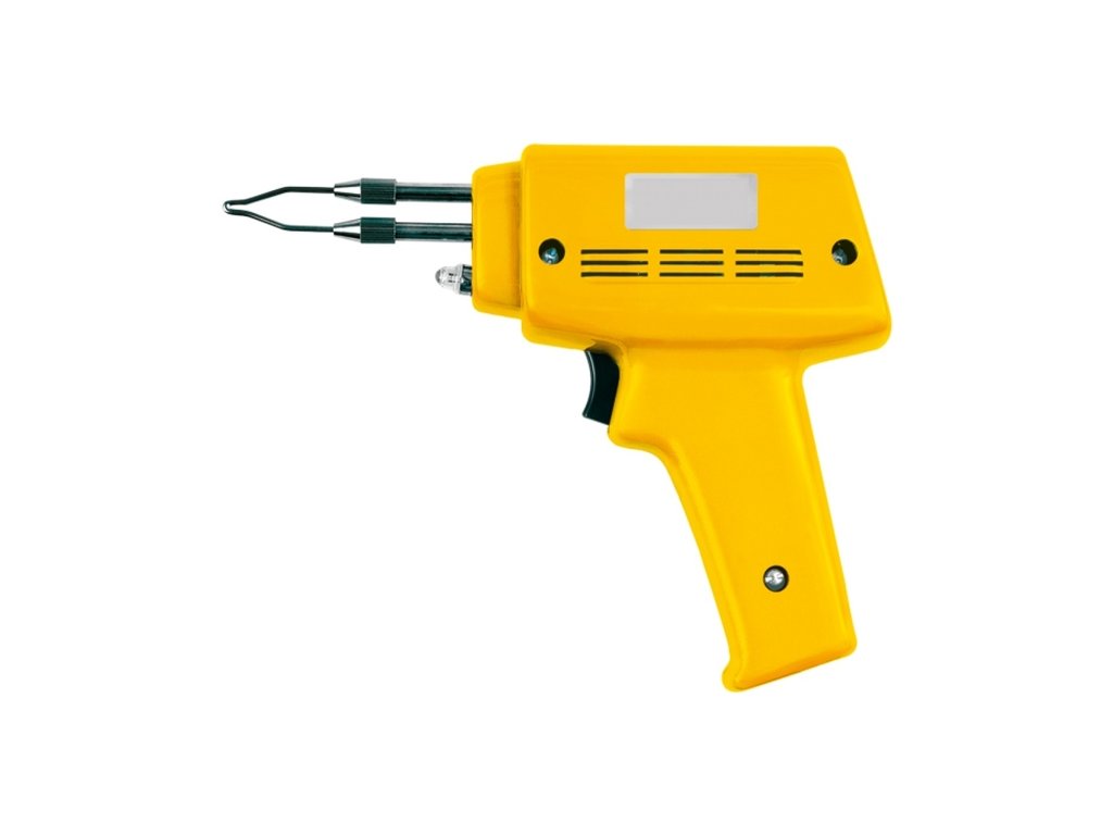 Pistolová transformátorová pájka Vorel 100 W pro všestranné použití v elektrotechnice a dílně. Klasické provedení se žárovkou na osvětlení pracovní plochy. Baleno v kartonové krabici, bez příslušenství.
