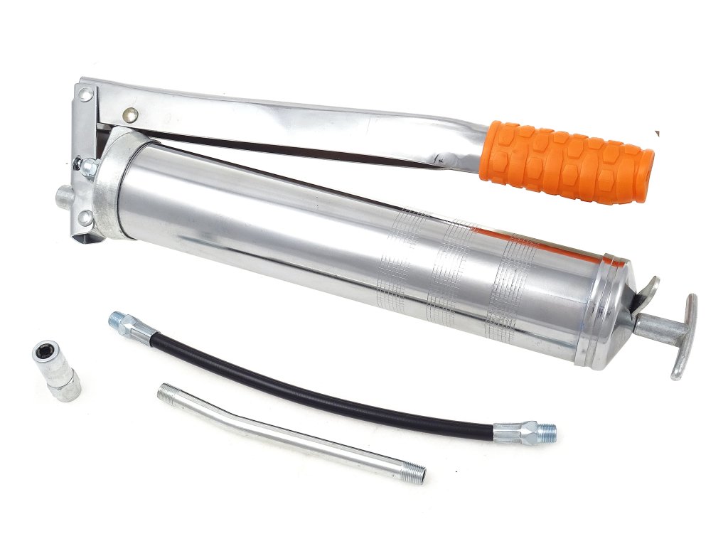 Dodáváno se dvěma hadičkami s mazacím konektorem: kovová (pevná – délka 170 mm) a gumová – ohebná (tzv. flexibilní, délka 240 mm) pro přístup k hůře dostupným mazacím konektorům. Páka má gumový potah pro pohodlnější dávkování maziva.