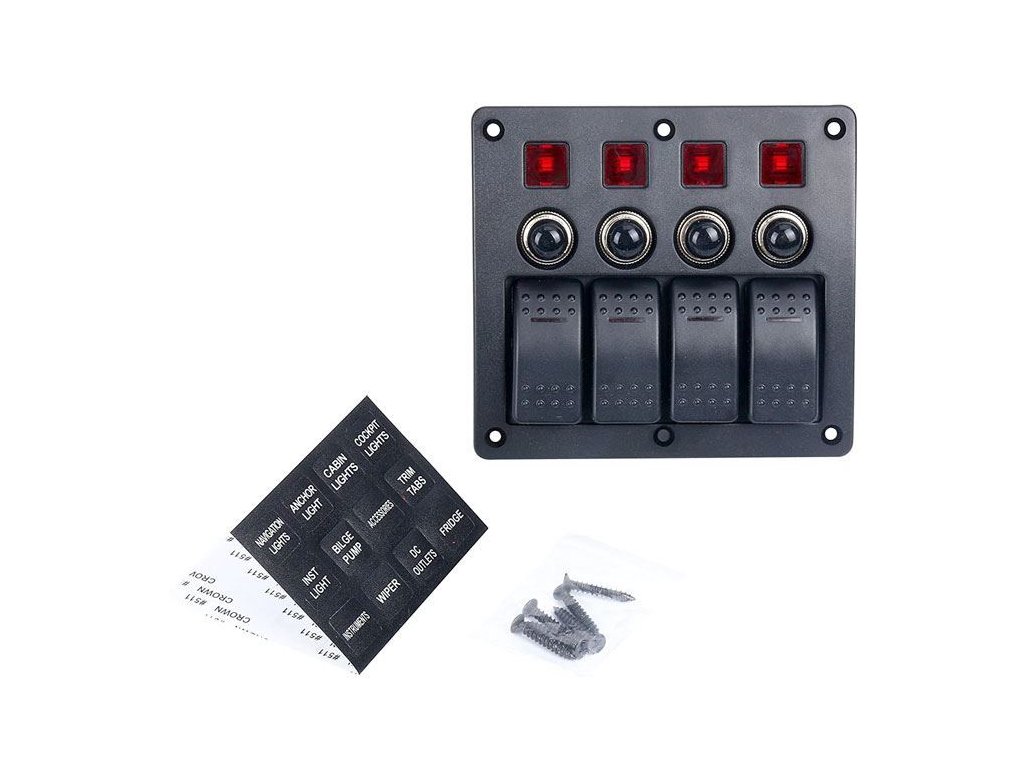 4x 1pólový vypínač s prosvětlením 12V/20A - 24V/10A, 4x jistič 5A/32VDC, včetně kabeláže. 28 štítků k nalepení na prosvětleníDoplňkové parametry