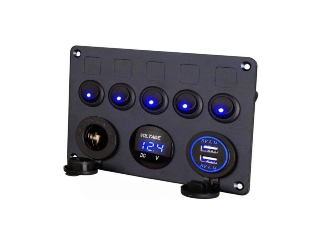 Panel s pěti 1pólovými vypínači s modrým prosvětlením, 2x zdířka USB 5V 2,1A, 1x napájecí zdířka 12V, 1x modře podsvětlený voltmetr.<BR/>45x samolepící štítek s různými nápisy na vypínač. <BR/><BR/>**Specifikace:** <BR/>Napájecí napětí: 12-24VDC <BR/>Rozměry panelu: 150x105mm <BR/><BR/>**Funkce:** <BR/>Přepínače jsou vybaveny kompletní kabeláží s mini auto pojistkami 15A. Samotný vypínač je dimenzován na 12V/20A a je jednopólový.Doplňkové parametry