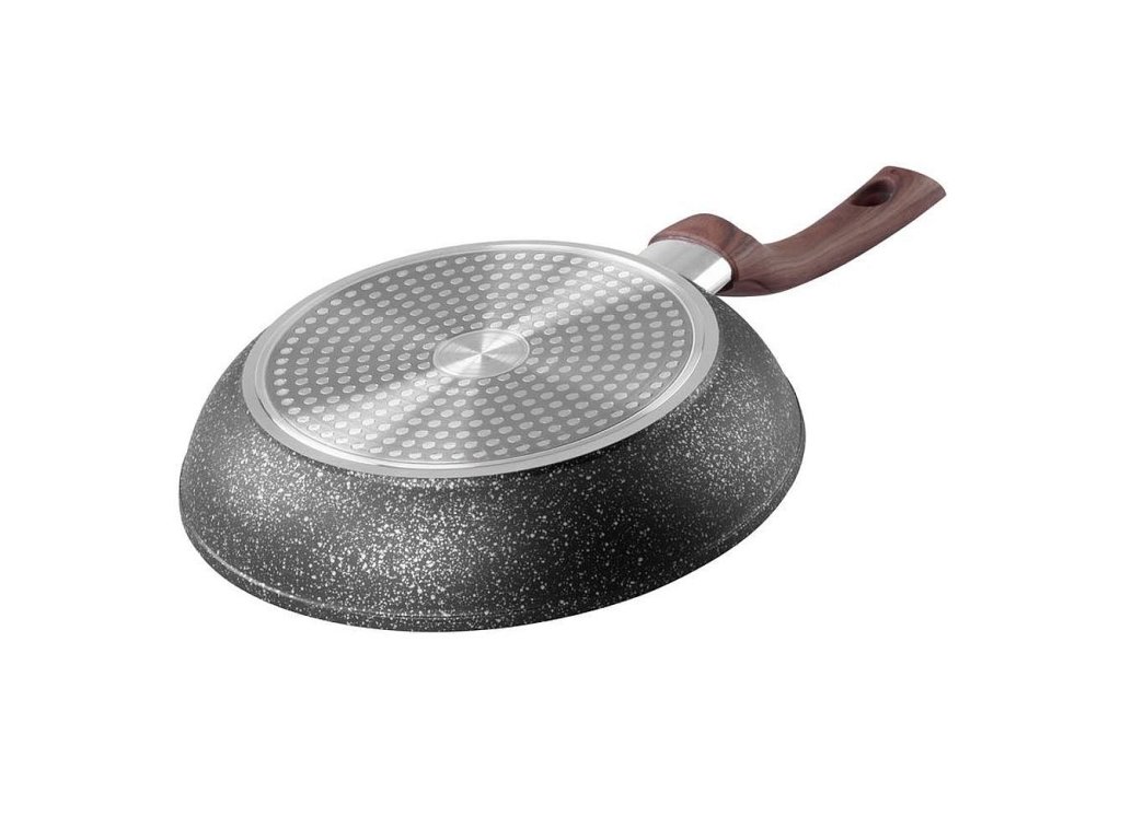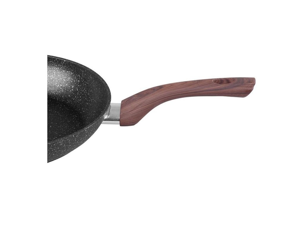 Pánev vyrobená ze slitiny hliníku s nepřílnavým povrchem a 3vrstvým mramorovým nátěrem.