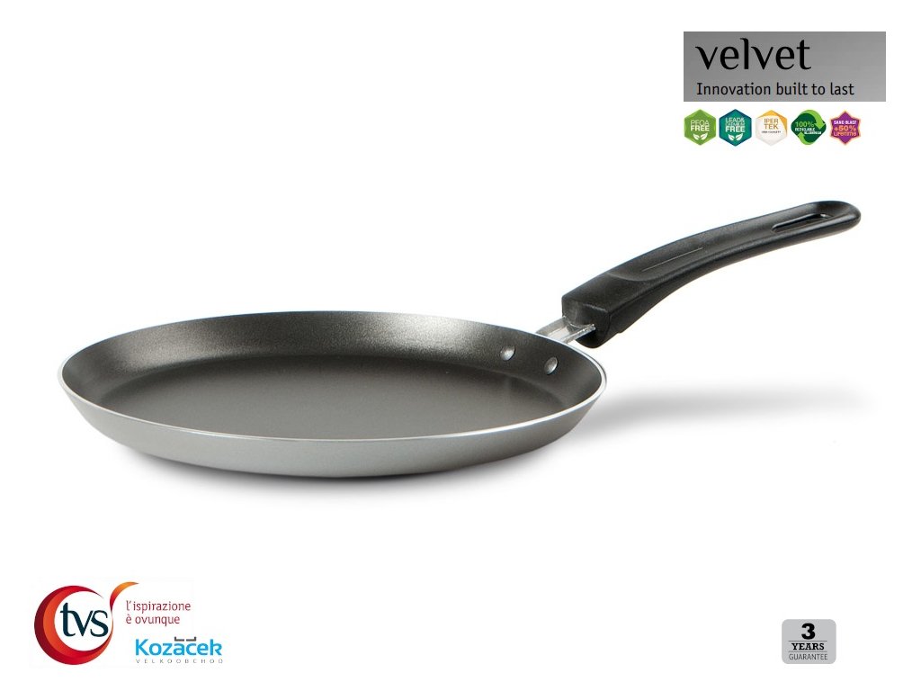 Lehká hliníková pánev na palačinky s vnějším lakováním, které je odolné proti oděru a poškrábání.Nádobí z řady VELVET je vybaveno kvalitním vnitřním nepřilnavým dvouvrstvým povrchem IPERTEK z dílny italského výrobce TVS s.p.a.
