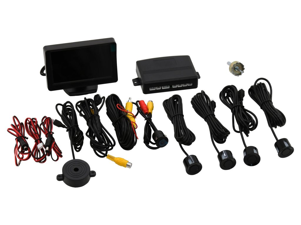 Balení obsahuje LCD displej, řídící jednotku, zvukový modul, kameru a 4 senzory pro montáž do zadního nárazníku, odpovídající kabeláž a vrtáky odpovídajích průměrů.