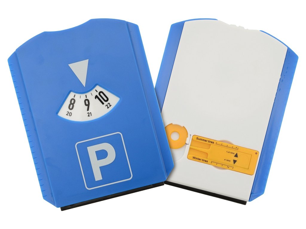 Tři hrany parkovacích hodin jsou provedeny jako břity škrabky, kterou lze použít na sníh, led a stranu s gumovým břitem i na vodu.