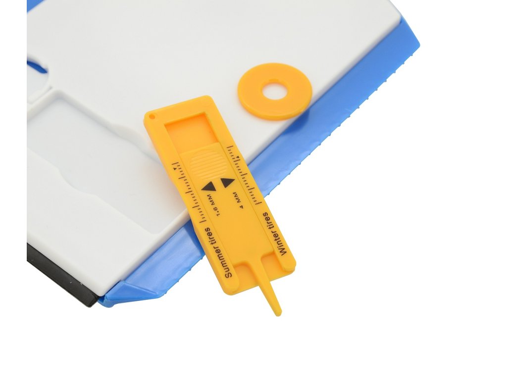 Navíc jsou na zadní straně připevněny další užitečné pomůcky. Žeton do nákupního vozíku a měrka pro orientační měření hloubky dezénu pneumatik.