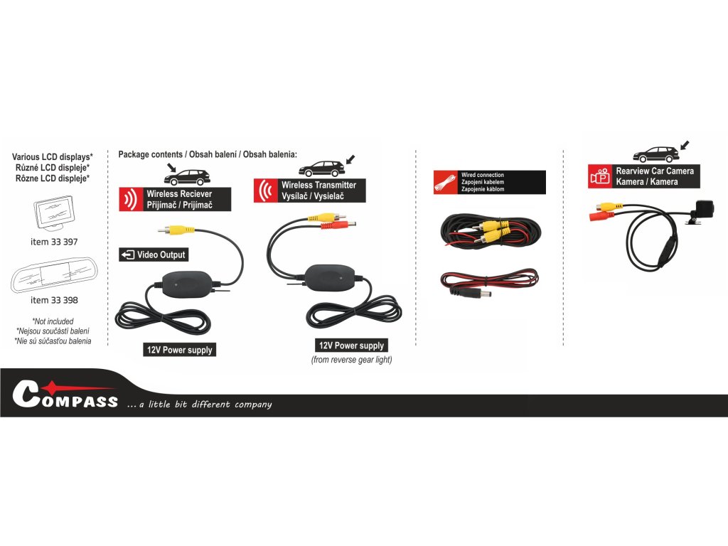 Balení obsahuje 1x kameru, bezdrátový vysílač a přijímač video signálu, kompletní kabeláž pro propojení s napájením i bezdrátovým vysílačem a přijímačem a pro případ potřeby i kabeláž pro přímé propojení bez bezdrátového přenosu.