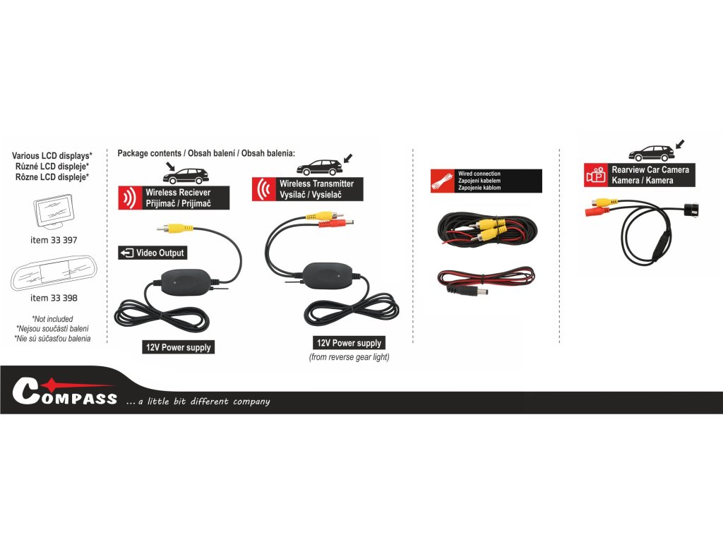 Balení obsahuje 1x kameru, bezdrátový vysílač a přijímač video signálu, kompletní kabeláž pro propojení s napájením i bezdrátovým vysílačem a přijímačem a pro případ potřeby i kabeláž pro přímé propojení bez bezdrátového přenosu a vrták pro předvrtání otvoru pro kameru.