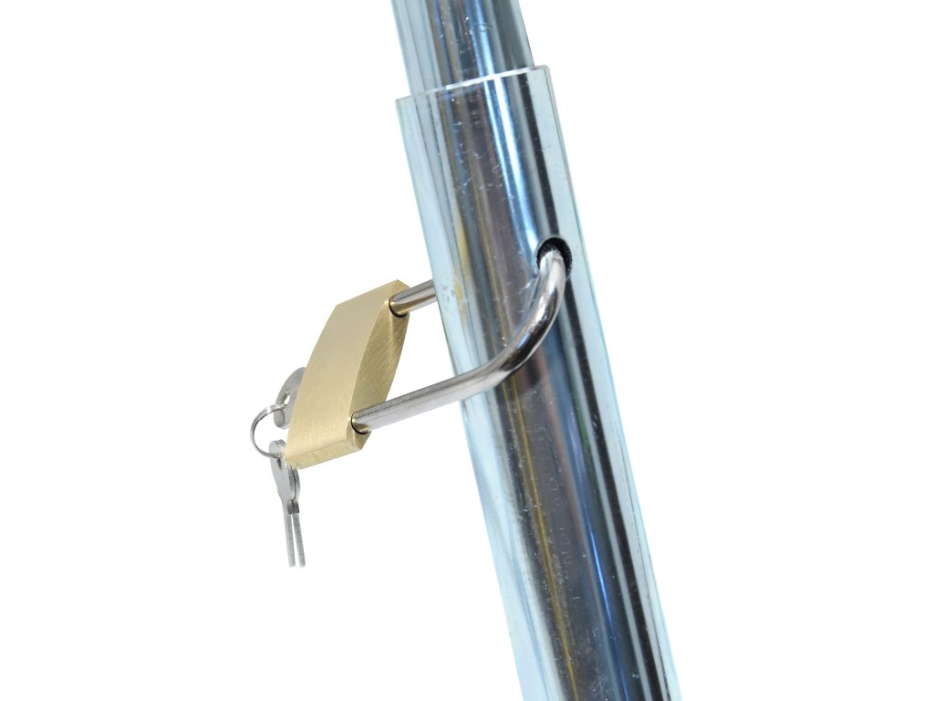 Zábrana je tvořena robustní konstrukcí s povrchovou úpravou vhodnou do venkovních prostor. Zamykání je řešeno visacím zámkem umístěným na šikmé, teleskopické části konstrukce, tak aby po odemčení bylo možné zábranu jednoduše a rychle složit.