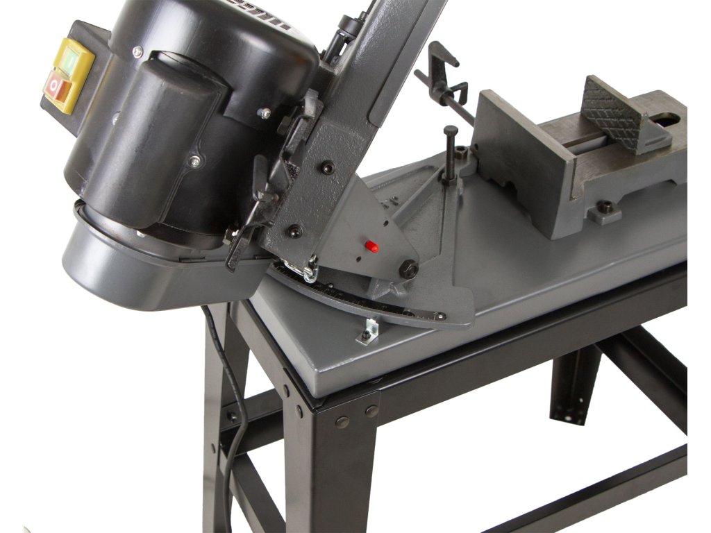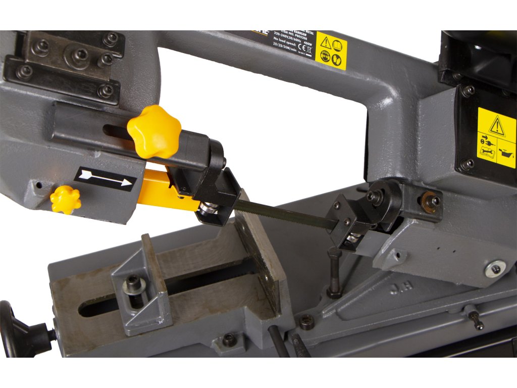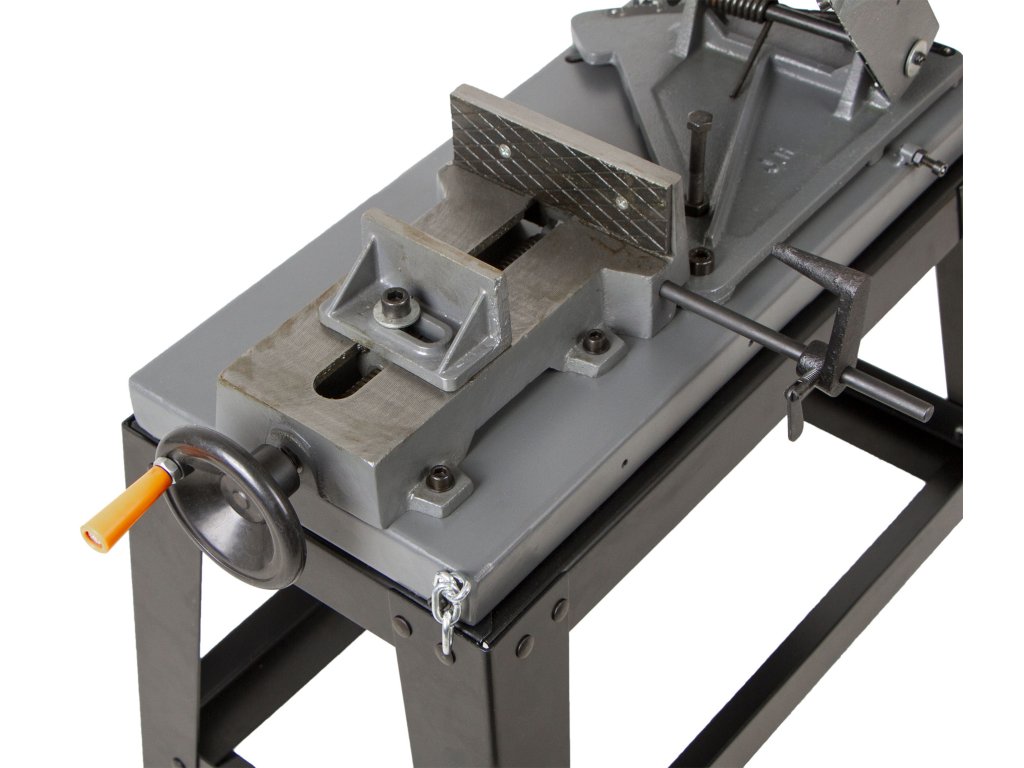 Pro pevné ukotvení materiálu před řezáním je pila vybavena také strojním svěrákem, který má jednu pevnou a jednu otočnou stranu pro ukotvení i nesouměrných dílů.
