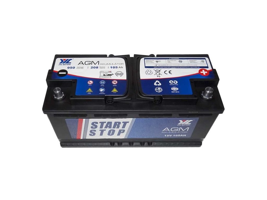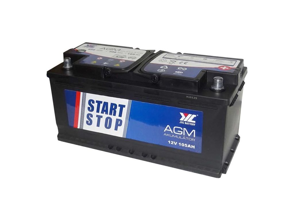 Pb akumulátor JYC Start-Stop AGM 12V/105Ah pravá Olověná baterie AGM pro všechna vozidla, zvláště pak pro vozidla se systémem start-stop. Spodní patka B13 zabezpečí snadné uchycení. Dodávaná v nabitém stavu.**Specifikace:**