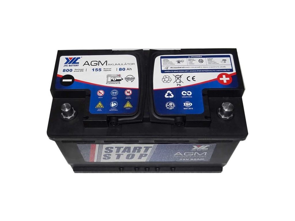 Pb akumulátor JYC Start-Stop AGM 12V/80Ah pravá Olověná baterie AGM pro všechna vozidla, zvláště pak pro vozidla se systémem start-stop. Spodní patka B13 zabezpečí snadné uchycení. Dodávaná v nabitém stavu.**Specifikace:**