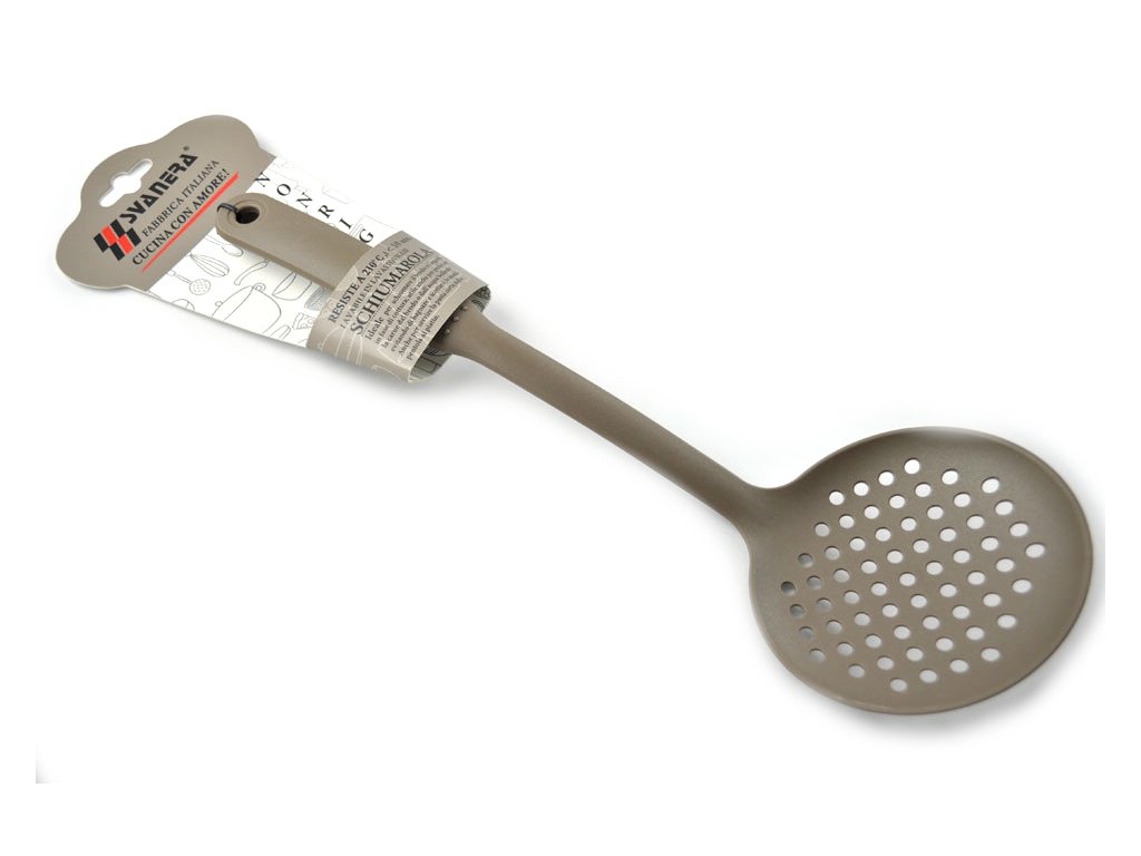 Celo nylonová cedící lžíce s očkem na zavěšení.Nylon je odolný teplotám do 210°C a šetrný ke všem povrchům nádobí.