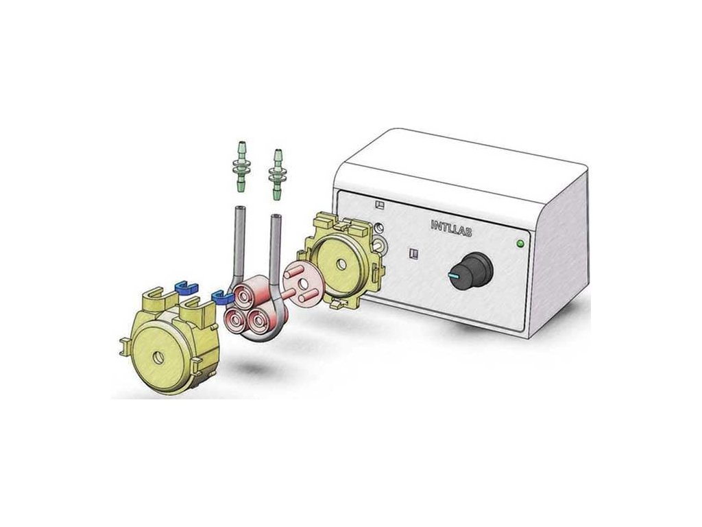 Peristaltické čerpadlo INTLLAB DP-385 vč.zdroje a obalu, hadička 4mm Peristaltické čerpadlo funguje na principu posouvání tekutiny v hadičce formou postupného mačkání odvalováním válečků ve směru proudu. Nemůže tedy kontaminovat čerpanou tekutinu.**Specifikace:**