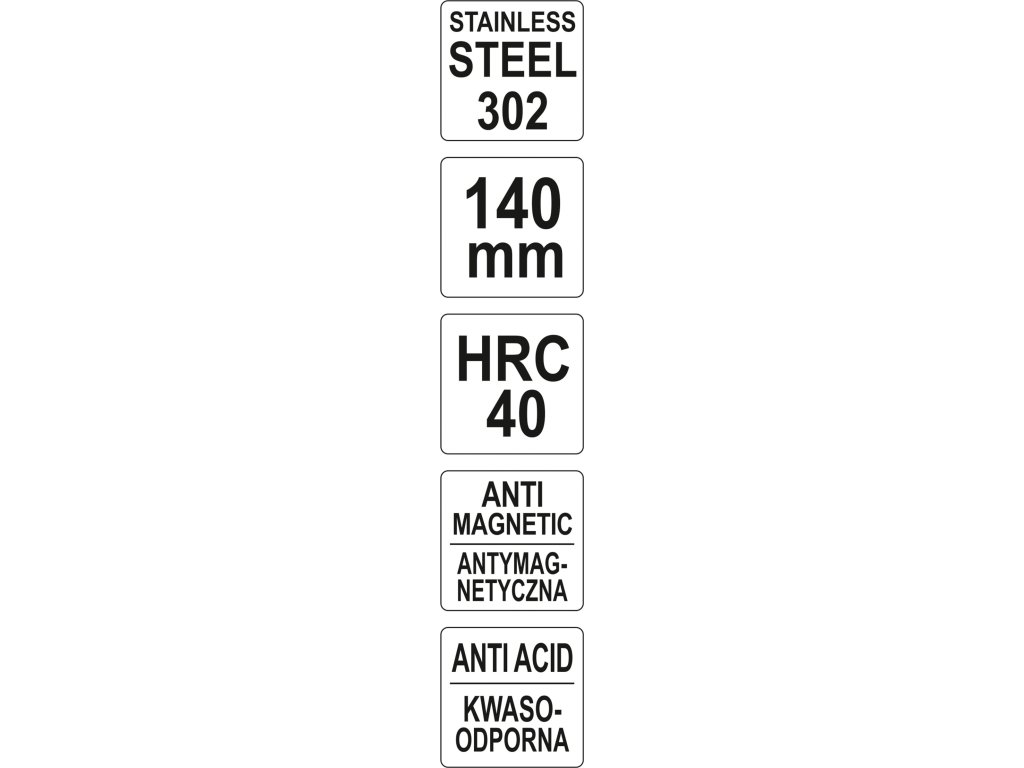 Pinzeta je vyrobena z nerezové oceli SS302 se zvýšenou tvrdostí HRC40, odolná vůči kyselinám.