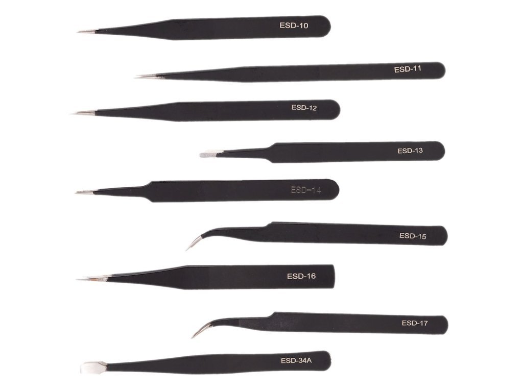 Sada obsahuje kompletní řadu pinzet s různými tvary a velikostmi hrotů, které pokryjí všechny potřeby precizní práce. Jednotlivé pinzety jsou označeny kódy ESD a nabízejí širokou škálu možností použití: