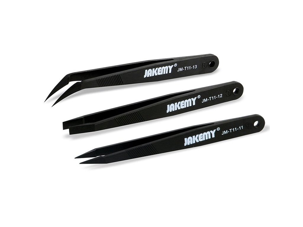 Precizní pinzety s různě tvarovanými čelistmi, jednotná délka 118 mm, antistatické, sada 3 kusů – JAKEMY JMT11