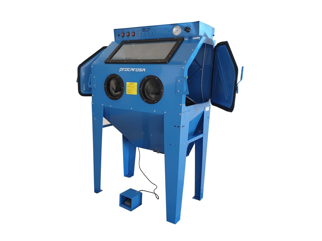 Vlastnosti pískovacího boxu Procarosa PROFI350: Jedná se v naší modelové řadě o nejmenší box s integrovaným odsáváním. Má dvoje boční dveře pro snadnější přístup, zajímavostí je potom pistole s ručním ovládáním + stacionární tryska uvnitř kabiny, která díky ovládání pískovacího procesu nohou, umožňuje držet pískovaný předmět oběma rukama. Samozřejmostí je dále výkonné osvětlení a velký vnitřní prostor. Horní ovládací panel boxu je vybaven vypínačem, spínačem světel, spínačem odsávání, indikačními světly, manometrem a regulátorem vzduchu.