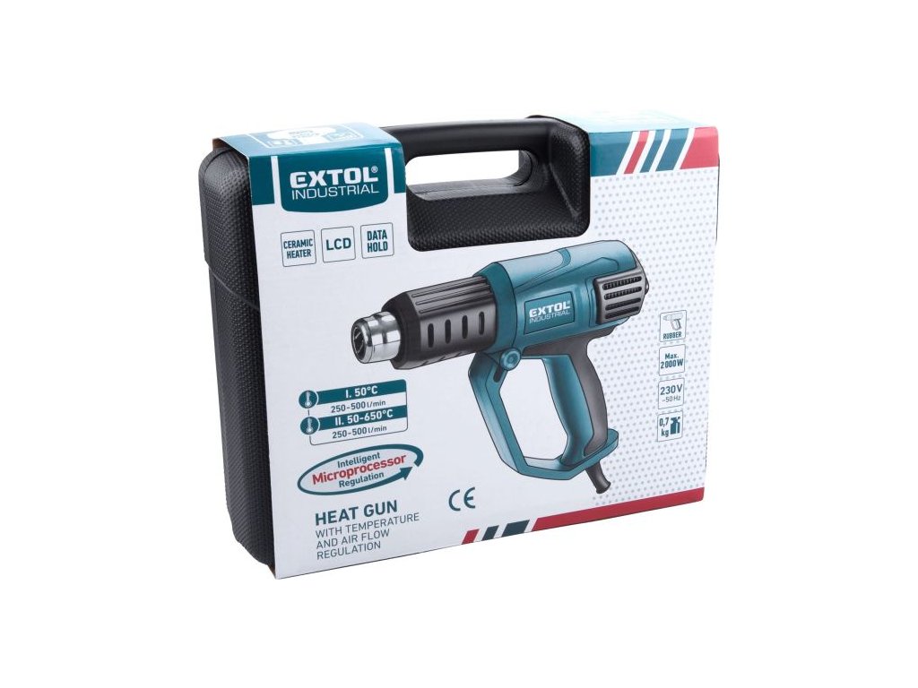 Pistole horkovzdušná s plynulou regulací, 2000W, EXTOL,8794800 Horkovzdušná pistole je určena k nahřívání povrchů za účelem odstranění nátěrů (barev, laků), k sušení čerstvě nanesených nátěrů, k tvarování a spojování umělých hmot (např. trubek) a asfaltových krytin, k uvolňování lepených spojů, k pájení, k rozmrazování zmrzlé vody v potrubí, k šetrnému sušení, k vypalování trávy a mechu ve špatně přístupných místech apod.. Pistole je vybavena velkým a přehledným LCD displejem.Doplňkové parametry