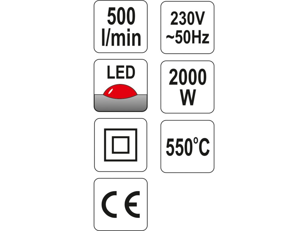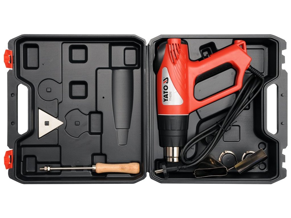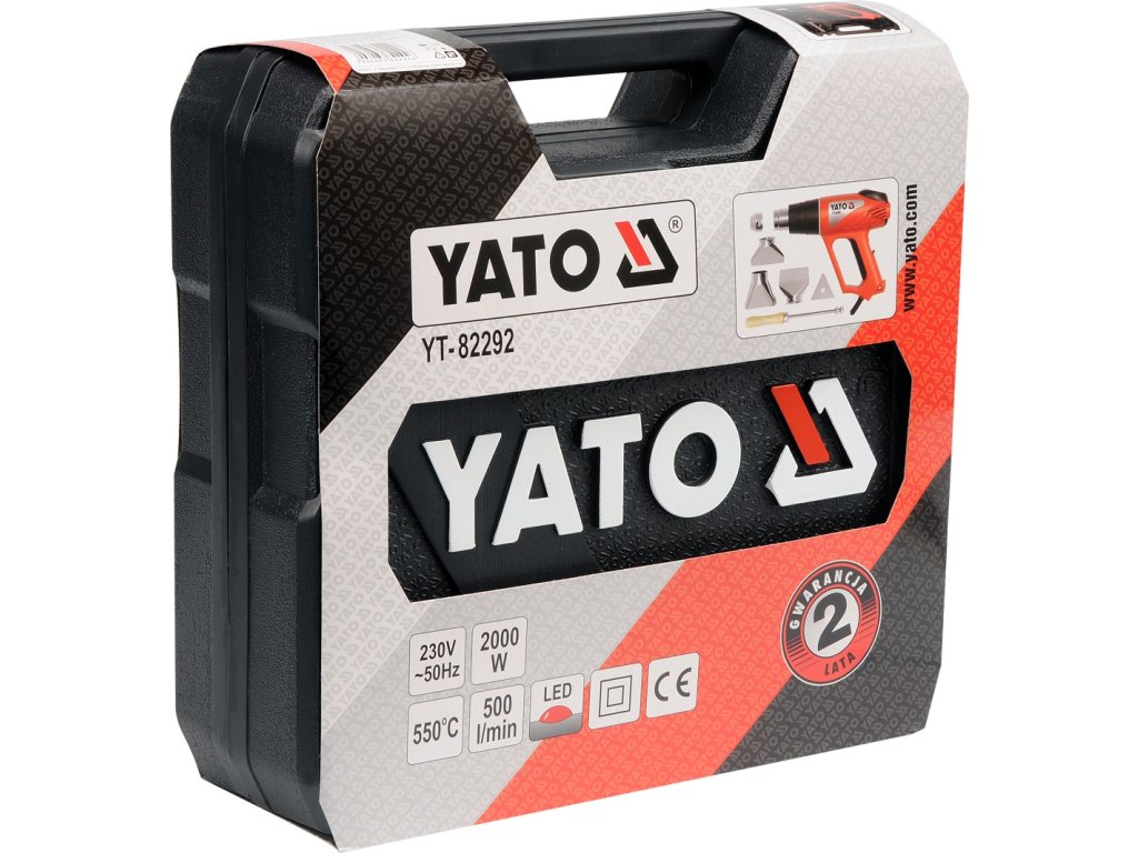 Klasická kvalitní horkovzdušná pistole Yato s třemi stupni výkonu, přičemž stupeň II a III má plynulou regulaci teploty. Teplota je signalizována stupnicí tvořenou 5 LED diodami. Pistole je vybavena čtyřmi usměrňovacími tryskami a škrabkou pro opalování starých nátěrů.
