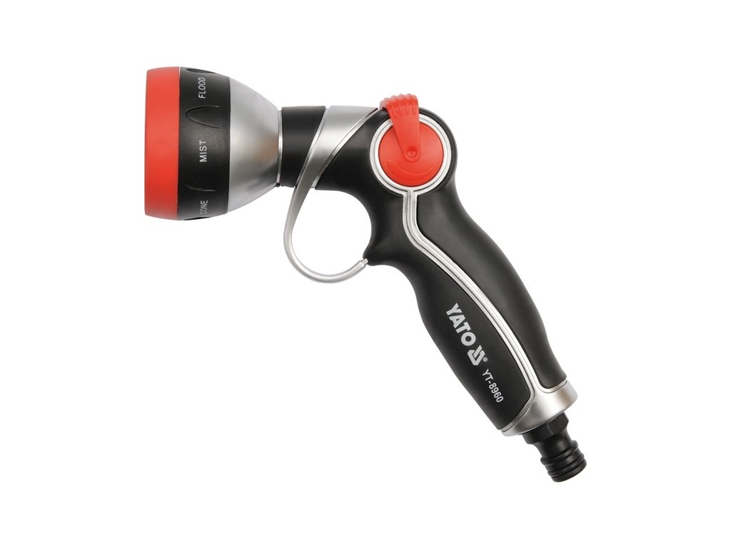 Postřikovací pistole se 7 možnostmi nastavení střiku (přímý proud, jemný mlhový střik a kuželový střik a další). Osazena závitem 1/2" (12.5mm). Je vyrobená z kvalitního ABS materiálu a hliníku. Možnost regulace průtoku vody. Rychlospojka pro snadné a rychlé připojení a odpojení.