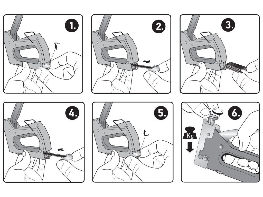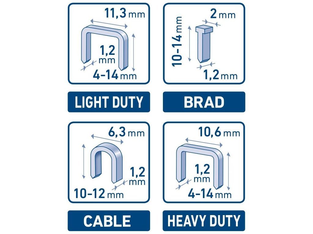 - doplňující parametr: možnost nastavení síly úderu, vhodné spony: výška 4-14mm, rozteč 10,6x tl.1,2mm+11,3x tl. 1,2mm, kabelové spony výšky 10-12mm rozteč 7,6mm, hřebíky s hlavičkou do max. délky 14mm