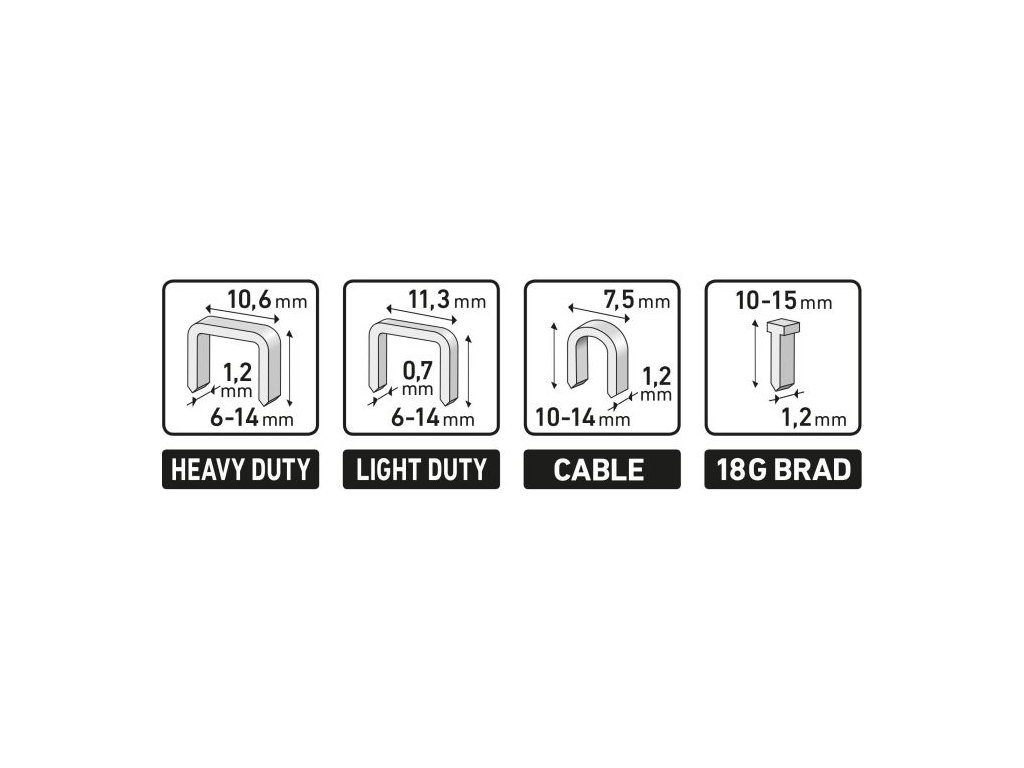 doplňující parametr - možnost nastavení síly úderu, vhodné pro4 typy spon: výška 6-14mm, rozteč 10,6x tl.1,2mm+ rozteč 11,3x tl.0,75mm, kabelové spony výšky 10-14mm rozteč 7,6mm, hřebíky s hlavičkou do max. délky 15mm