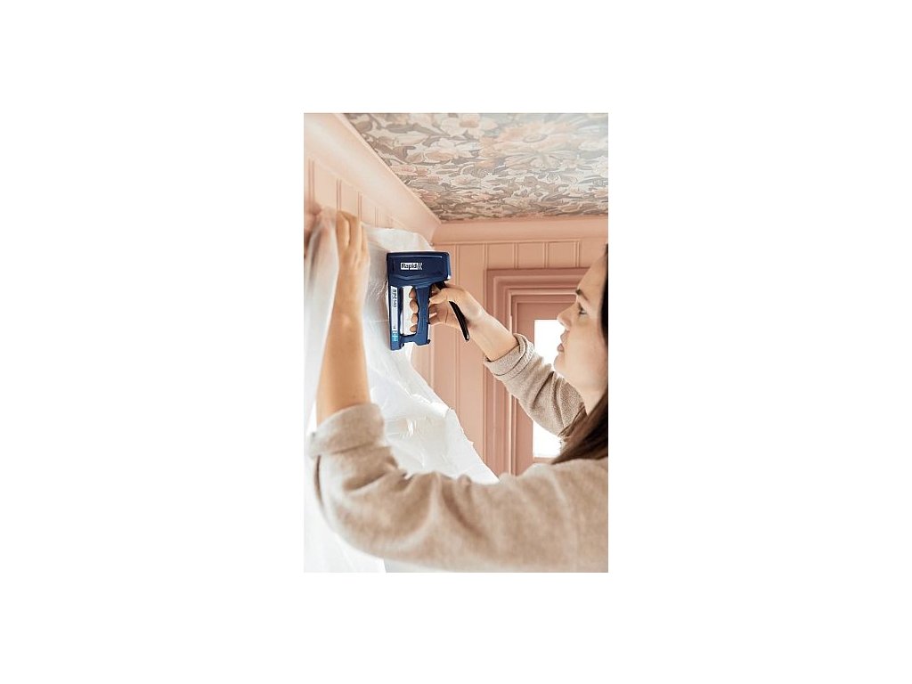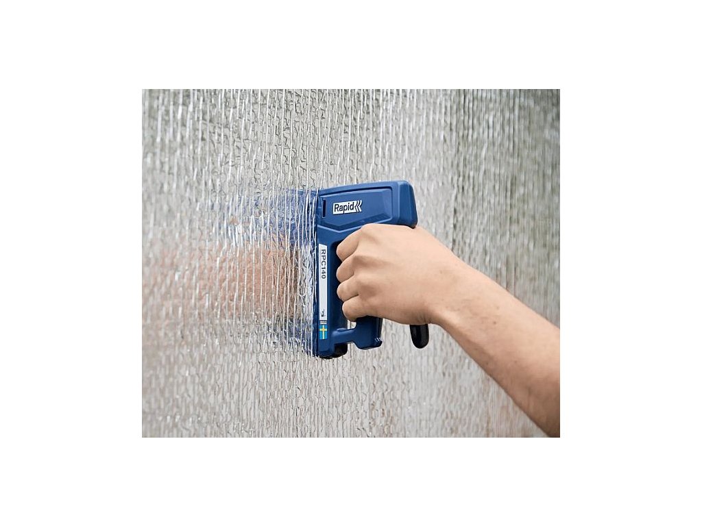 Snadno použitelná sponkovačka na sponky (6-16 mm) pro sešívání materiálů, jako je plastová fólie, masonit, koberce a vlnitá lepenka.