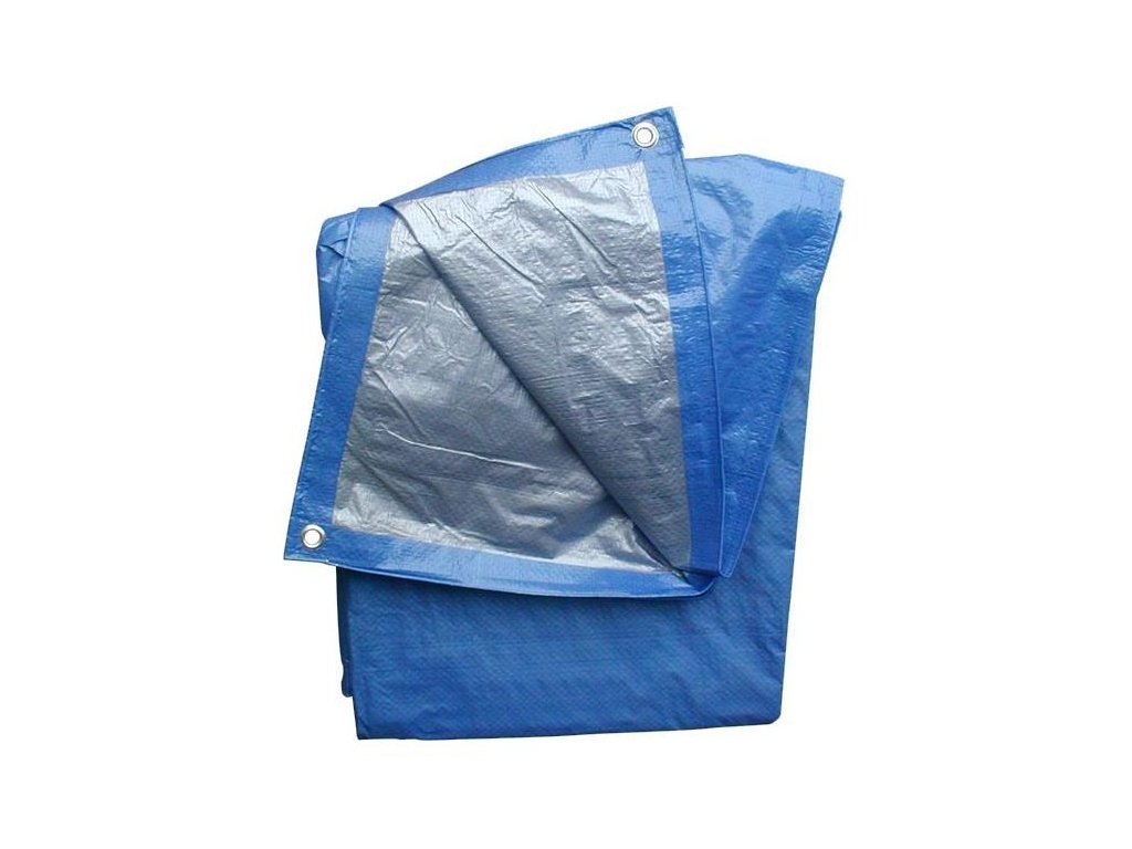 Krycí plachta modrostříbrná barva, kovová nerezavějící oka po obvodu.Hmotnost 10.5 kg (70 g/m2), přízí na čtvereční palec 7x7, jemnost příze 600 denier.