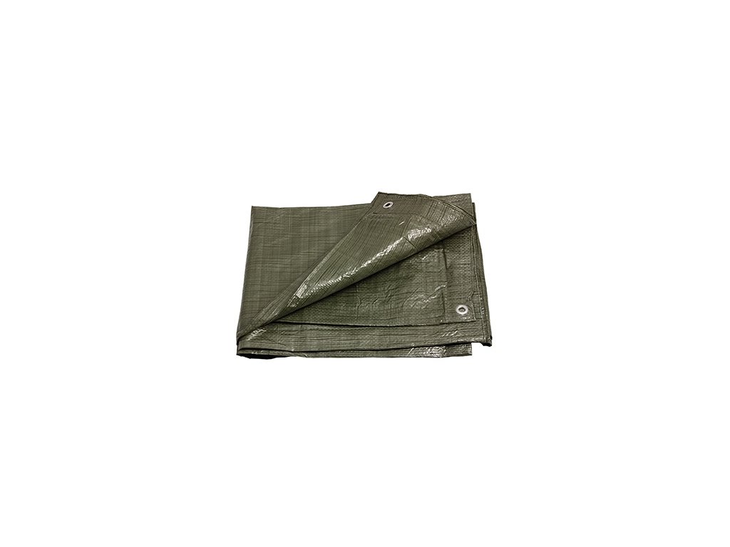 Ekonomická krycí plachta zelená barva, kovová nerezavějící oka po obvodu.Hmotnost 1.1 kg (70 g/m2), počet přízí na čtvereční palec 7x7, jemnost příze 600 denier.