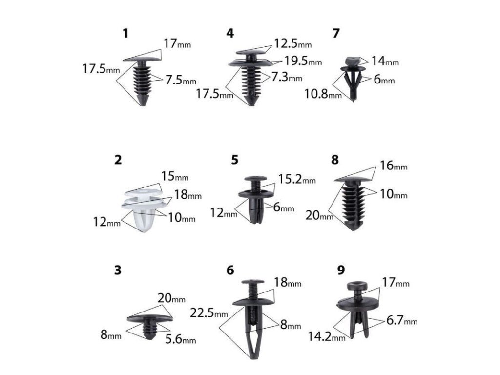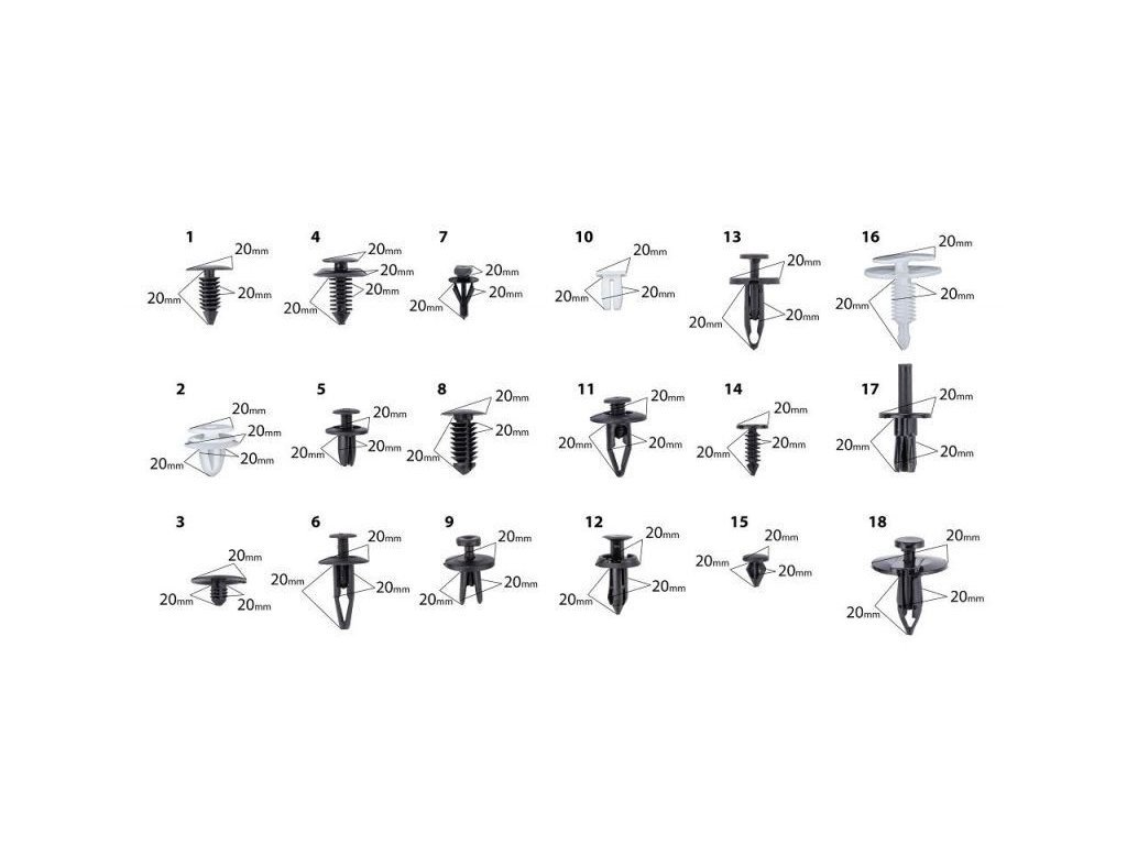 Široká škála 415 prvků v různých velikostech a tvarech vhodná do interiéru a exteriéru vozidel, motocyklů, karavanů a pod. Ideální pro uchycení čalounění, lišt, prahů, podběhů kol, nárazníků, blatníků a mnoha dalších plastových dílů.