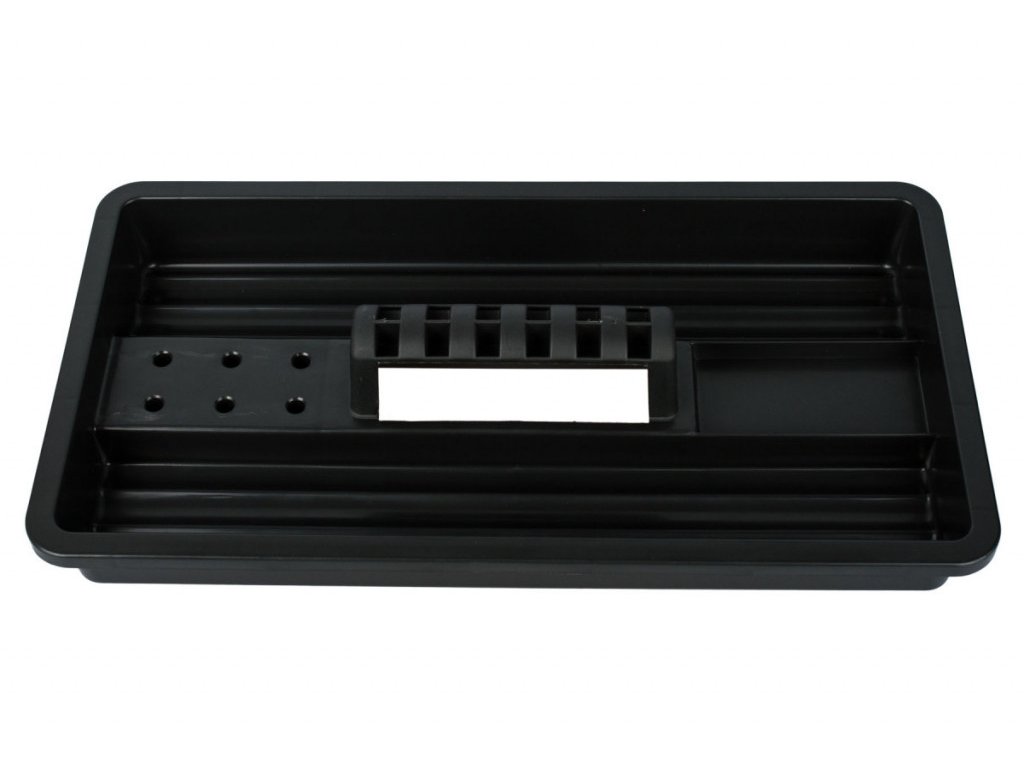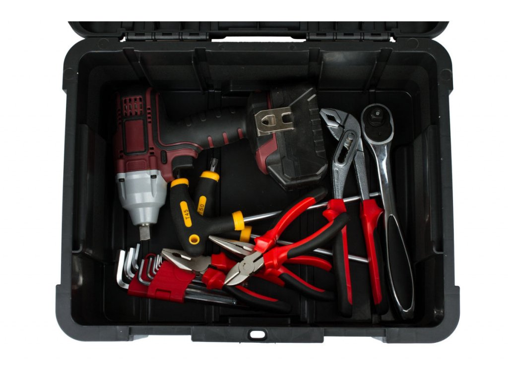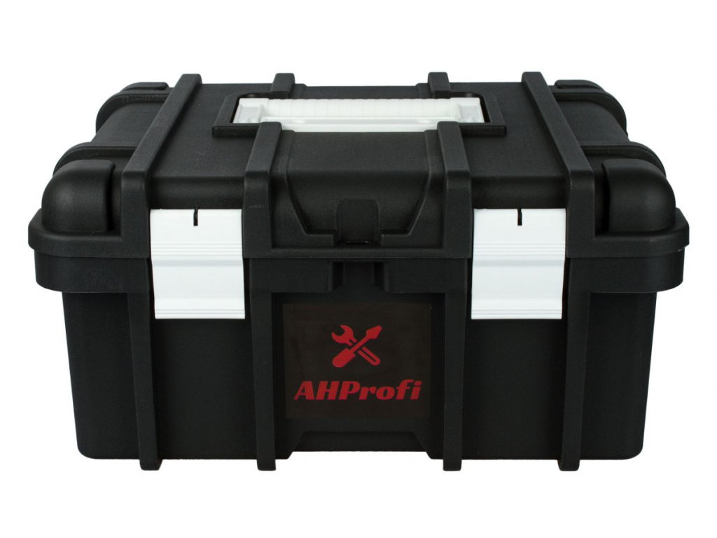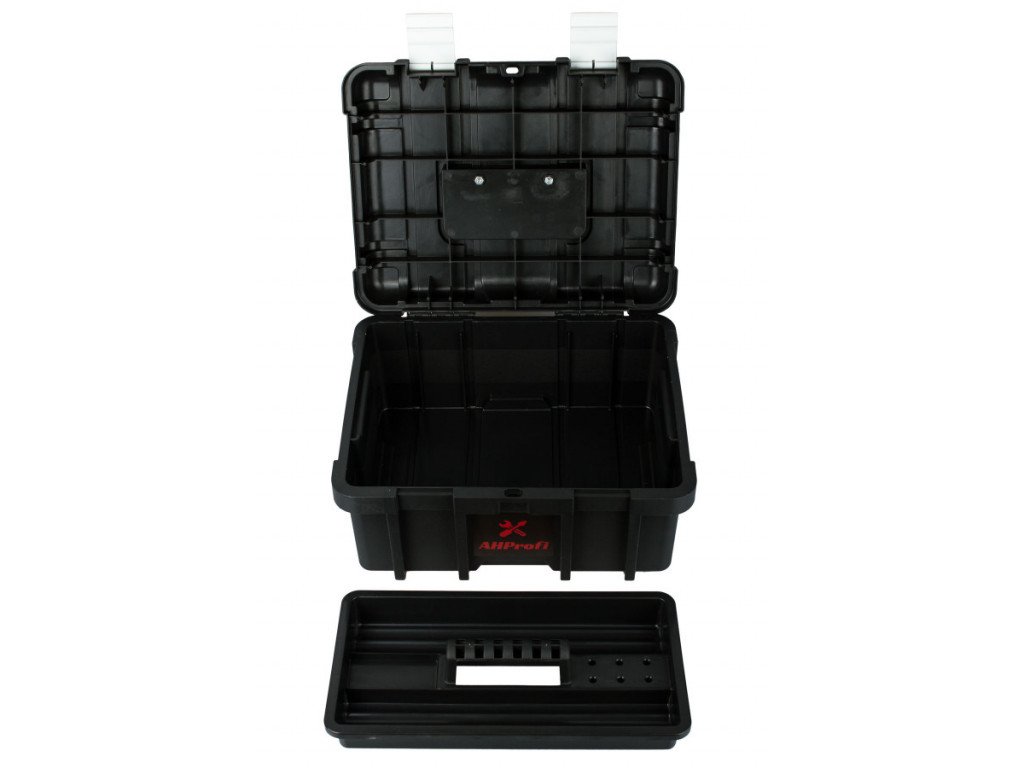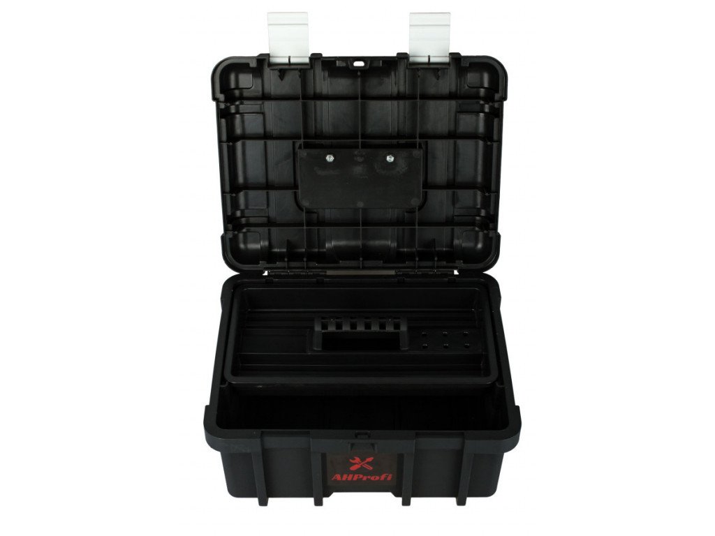 Plastový kufr na nářadí o rozměrech 41 x 32 x 20,5 cm. Kufr obsahuje přenosnou přepravku, která má např. držák na vrtáky.