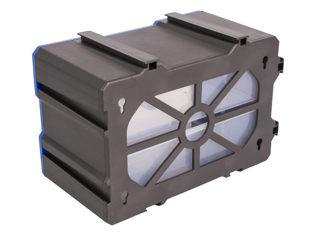 Plastový box má přepážku, kterou lze vyndat a mít jedno větší skladovací místo. Vhodný pro skladování a roztřídění šroubků, matic i většího nářadí. Box lze snadno vytáhnout z organizéru a zase jej vrátit zpět.