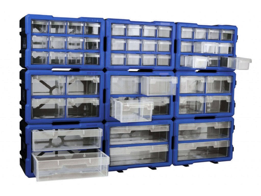 Plastové organizéry jsou lehce připojitelné a můžete organizéry složit a poskládat podle vašich představ (udělat z nich např. "stěnu", ve které budeme mít hezky uskladněny, a přehledně rozděleny např. šroubky, matice, či jiné drobné nářadí).