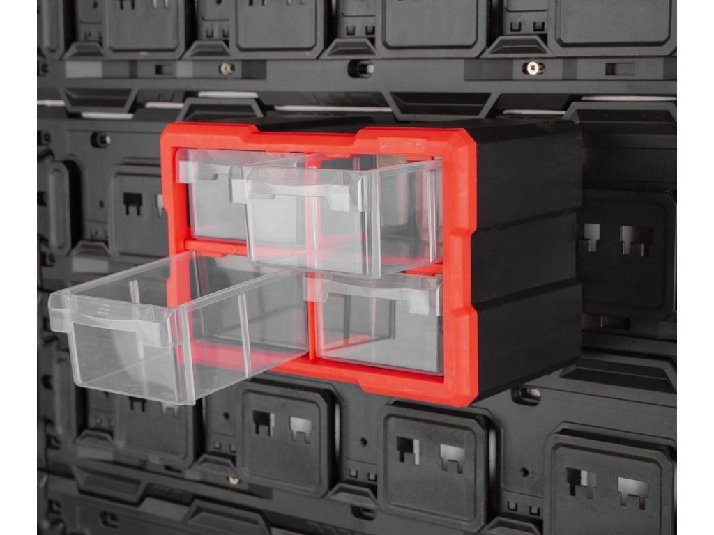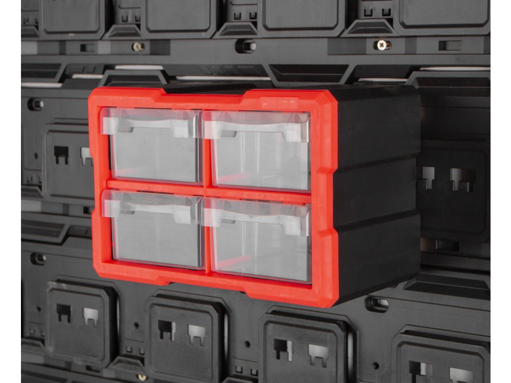 Tento organizér se 4 zásuvkami je perfektním doplňkem k závěsné desce MW7000. Poskytuje dostatek úložného prostoru pro různé drobné nářadí jako spojovací materiál, šrouby, matice a další malé předměty. Instalujte snadno kamkoliv do závěsného systému.