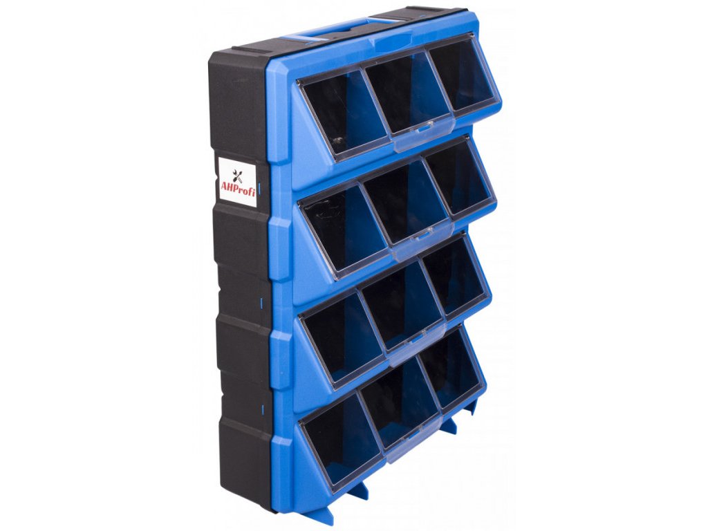 Plastový organizér s 12 zásuvkami lze jednoduše zavěsit na zeď, nebo např. z boku skříně, dílenského vozíku apod. Je možné ho postavit na ponk, nebo pracovní stůl a slouží pro uložení montážního materiálu a drobného dílenského vybavení.