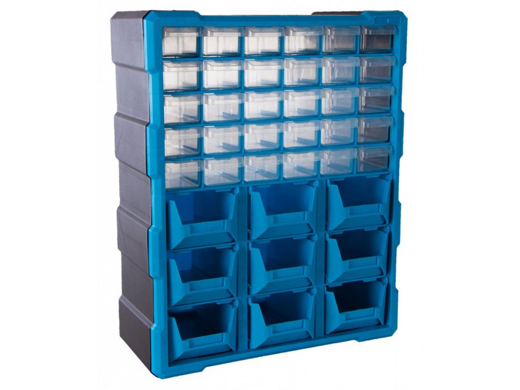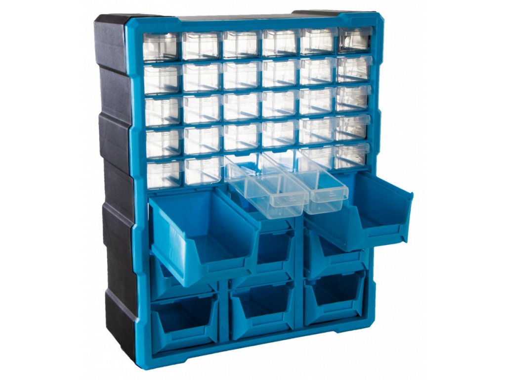 Plastový organizér s 39 zásuvkami lze jednoduše zavěsit na zeď, nebo např. z boku skříně, dílenského vozíku apod. Je možné ho postavit na ponk, nebo pracovní stůl a slouží pro uložení montážního materiálu a drobného dílenského vybavení.