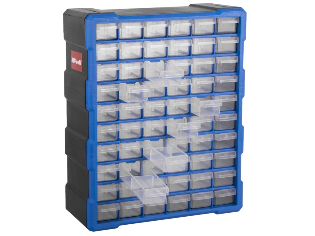 Plastový organizér s 60 zásuvkami lze jednoduše zavěsit na zeď, nebo např. z boku skříně, dílenského vozíku apod. Je možné ho postavit na ponk, nebo pracovní stůl a slouží pro uložení montážního materiálu a drobného dílenského vybavení.