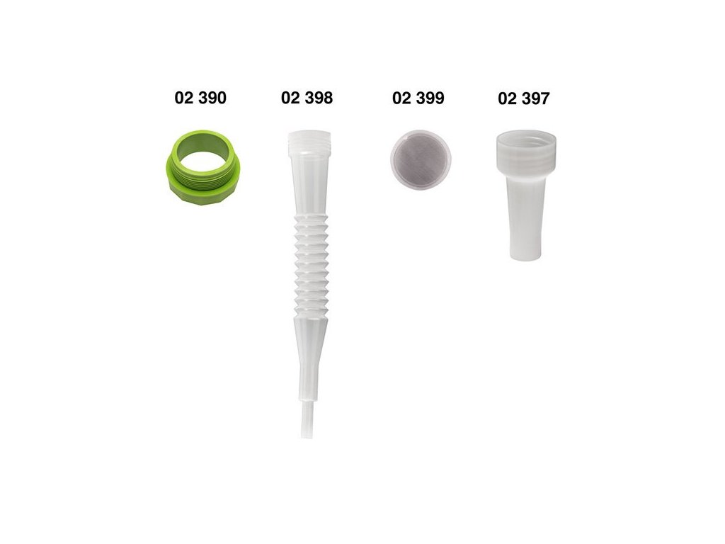 Plastový trychtýř / nálevka o objemu 10 l se sadou příslušenství: jemné nerezové sítko, pevný i flexibilní výtokový nástavec a šroubový adaptér na sud.
