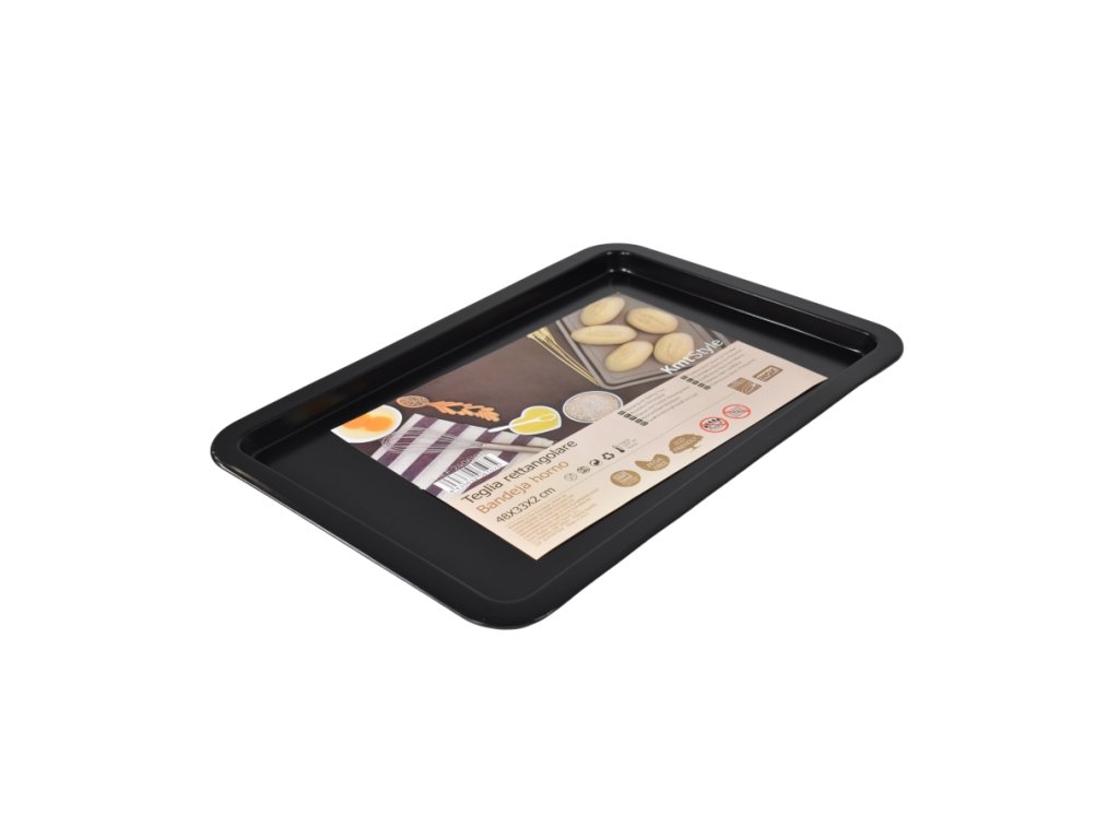 Pečící plech z uhlíkové oceli s nepřilnavým povrchem proti připálení.Rozměry 33 x 48 x 2 cm.