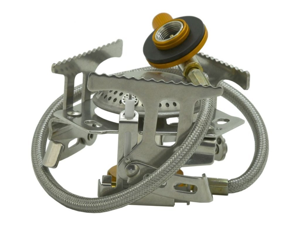 Outdoorový stojánkový vařičs piezoelektrickým zapalováním na propan-butan, pro ohřívání a přípravu pokrmů na cestách, v kempu apod.