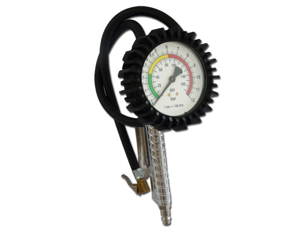 Přístroj na huštění pneumatik aut, motorek atd., pro tlak 0-12 bar, s analogovým tlakoměrem průměru 80 mm – O.M.G 63