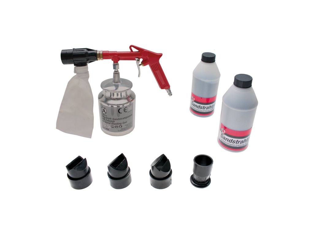 Pneumatická pískovací pistole, se sadou trysek a baleními tryskacího prostředku